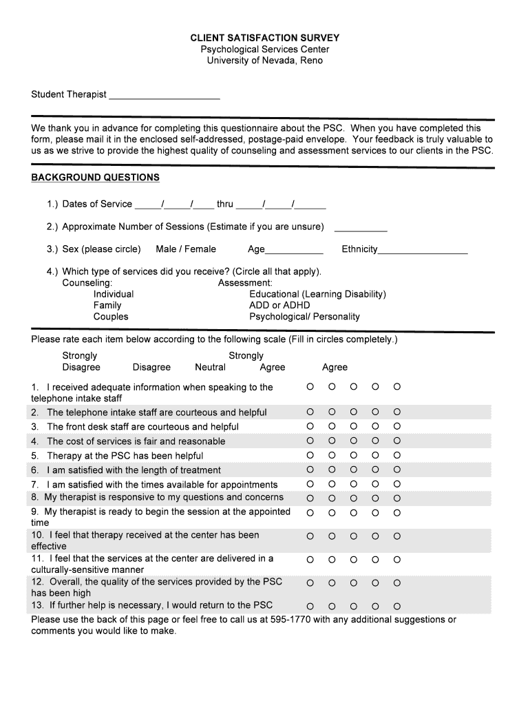 Get the free CLIENT SATISFACTION SURVEY Psychological Services Center ... - unr