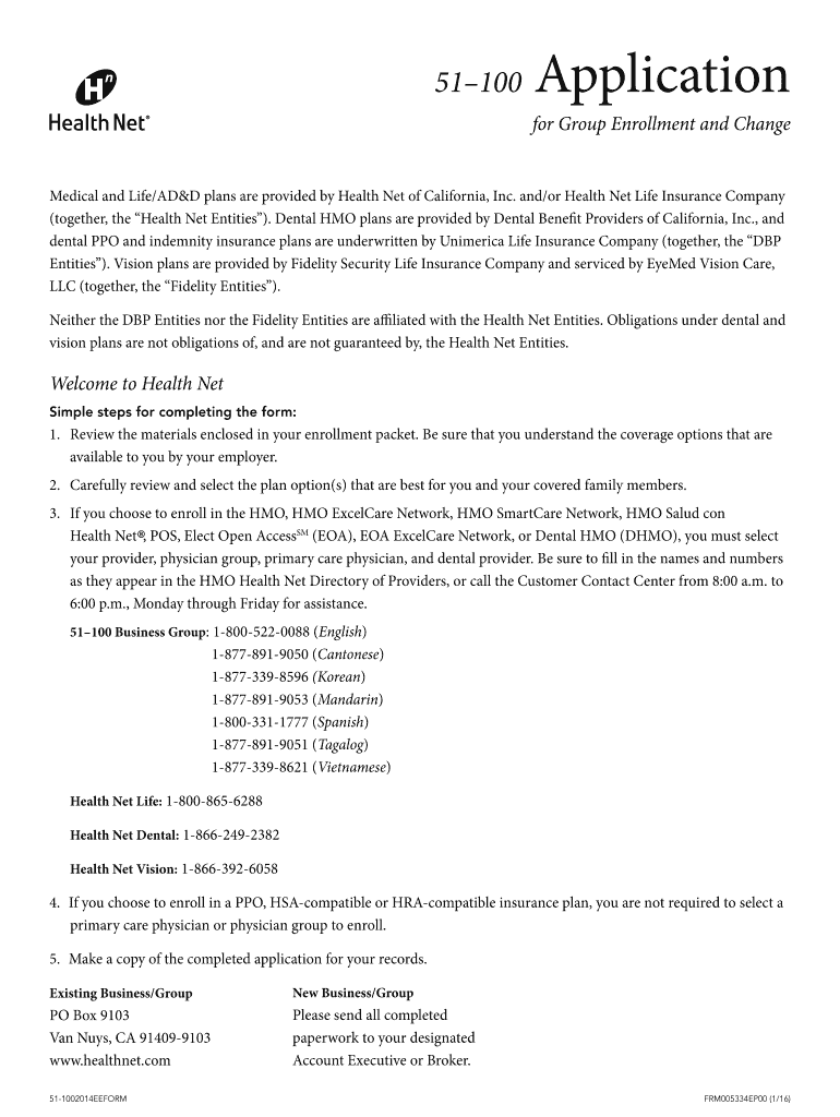 51100 Application for Group Enrollment and Change Medical and Life/ADD plans are provided by Health Net of California, Inc. and/or Health Net Life Insurance Company (together, the Health Net Entities).