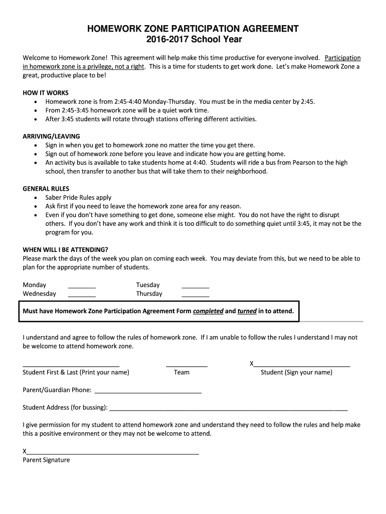 Get the free HOMEWORK ZONE PARTICIPATION AGREEMENT 2016-2017