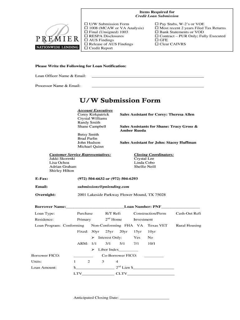 Items Required for Credit Loan Submission U/W Submission Form 1008 (MACAW or VA Analysis) Final (Unsigned) 1003 RESP Disclosures AUS Findings Release of AUS Findings Credit Report Pay Stubs, W2s or