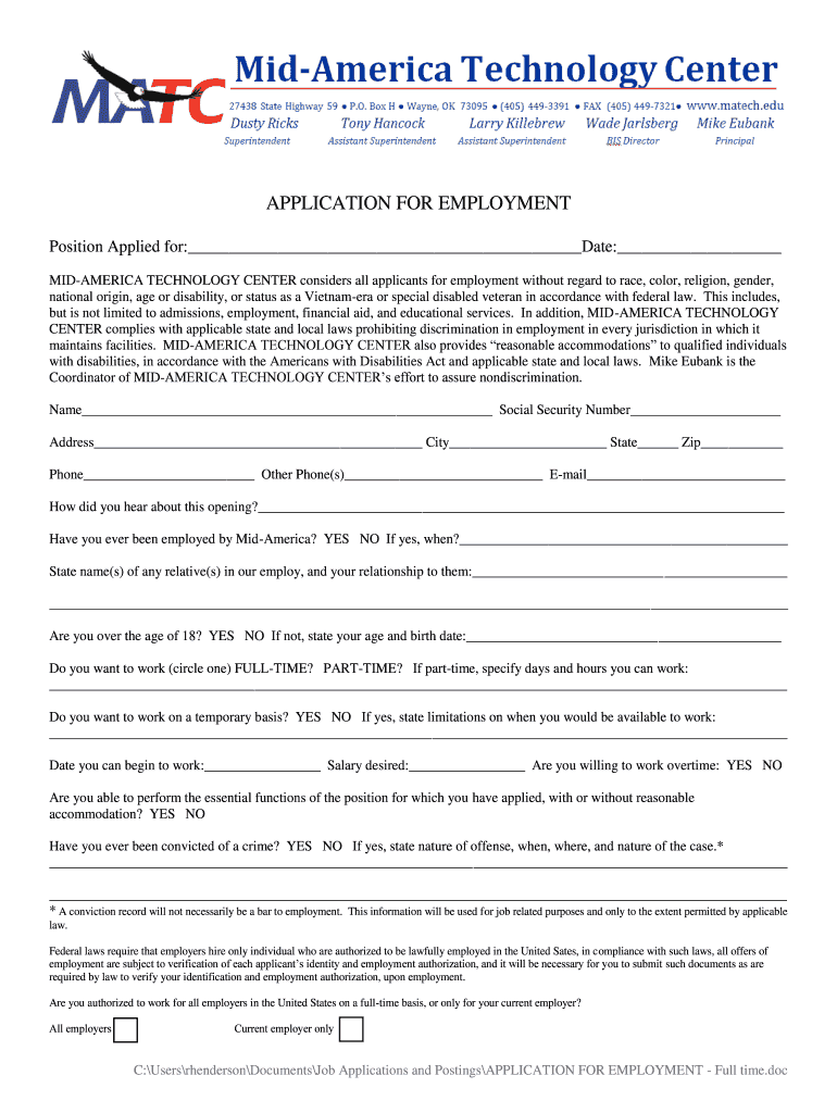 Get the free APPLICATION FOR EMPLOYMENT - matech.edu