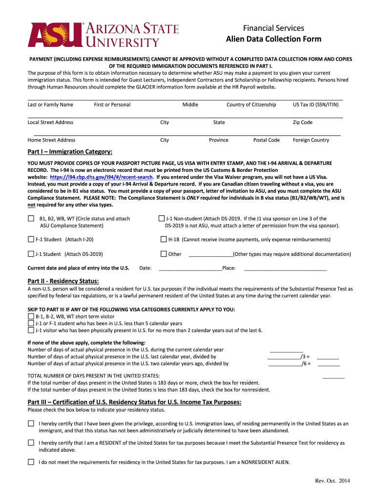 ... Certification of U.S. Residency Status for U.S ... Personal Services of a Nonresident Alien Individual) or IRS Form W ... a new Alien Data Collection Form ...