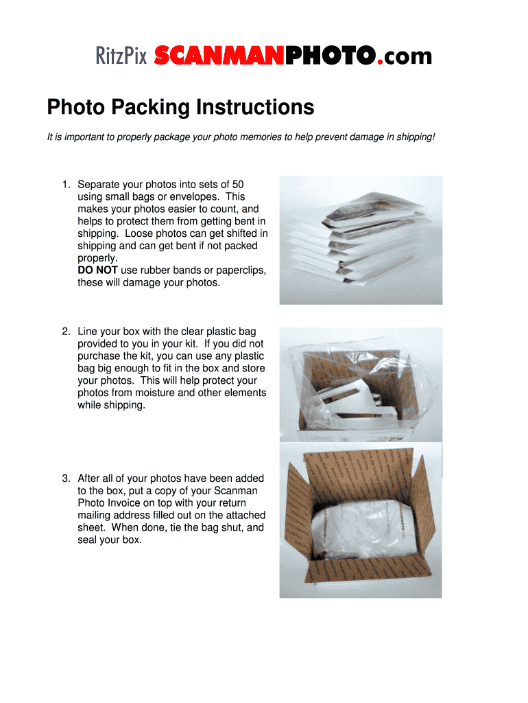 Ritz SCANMANPHOTO.com Photo Packing Instructions It is important to properly package your photo memories to help prevent damage in shipping! 1. Separate your photos into sets of 50 using small bags