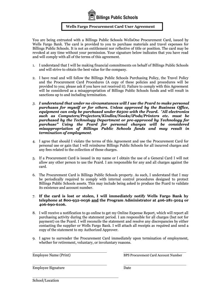 Wells Fargo Procurement Card User Agreement You are being entrusted with a Billings Public Schools Wellhole Procurement Card, issued by Wells Fargo Bank. The card is provided to you to purchase materials