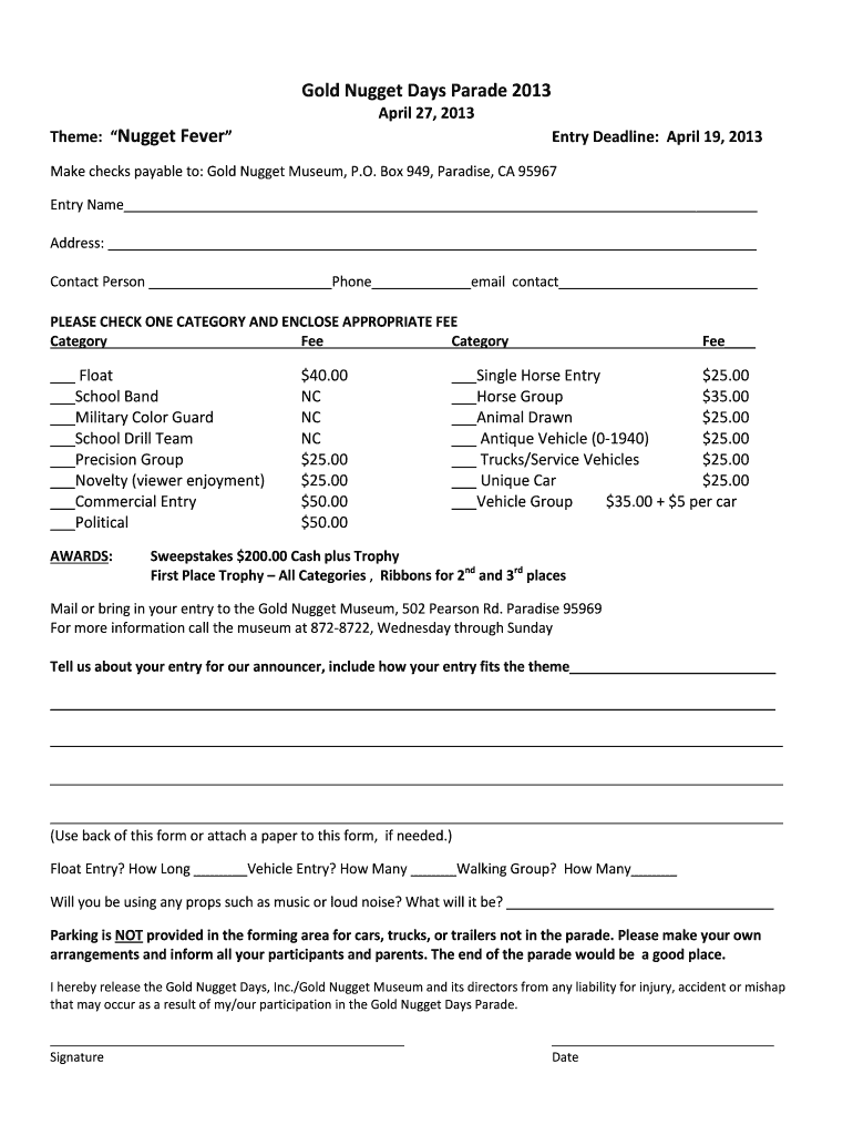 Gold Nugget Days Parade 2013 April 27, 2013, Theme: Nugget Fever Entry Deadline: April 19, 2013, Make checks payable to: Gold Nugget Museum, P.O. Box 949, Paradise, CA 95967 Entry Name Address: Contact