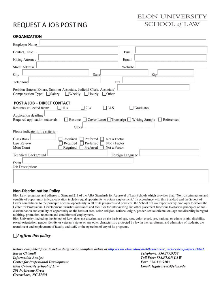REQUEST A JOB POSTING ORGANIZATION Employer Name Contact, Title Email Hiring Attorney Email Street Address Website City State Zip Telephone Fax Position (Intern, Ex tern, Summer Associate, Judicial