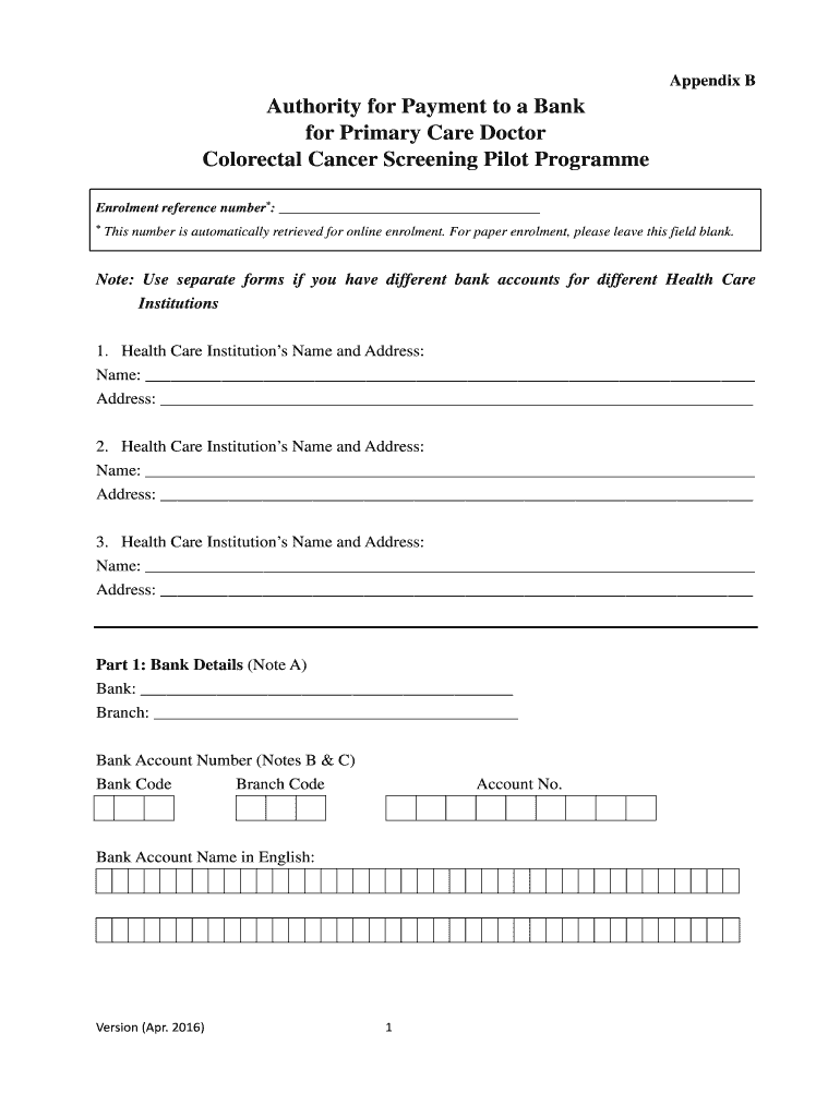 Version (Apr. 2016) 1. Appendix B. Authority for Payment to a Bank. For Primary Care Doctor. Colorectal Cancer Screening Pilot Program. Enrollment reference number.