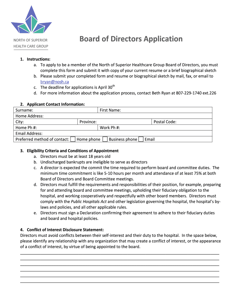 NORTH OF SUPERIOR HEALTH CARE GROUP Board of Directors Application 1. Instructions: a. To apply to be a member of the North of Superior Healthcare Group Board of Directors, you must complete this