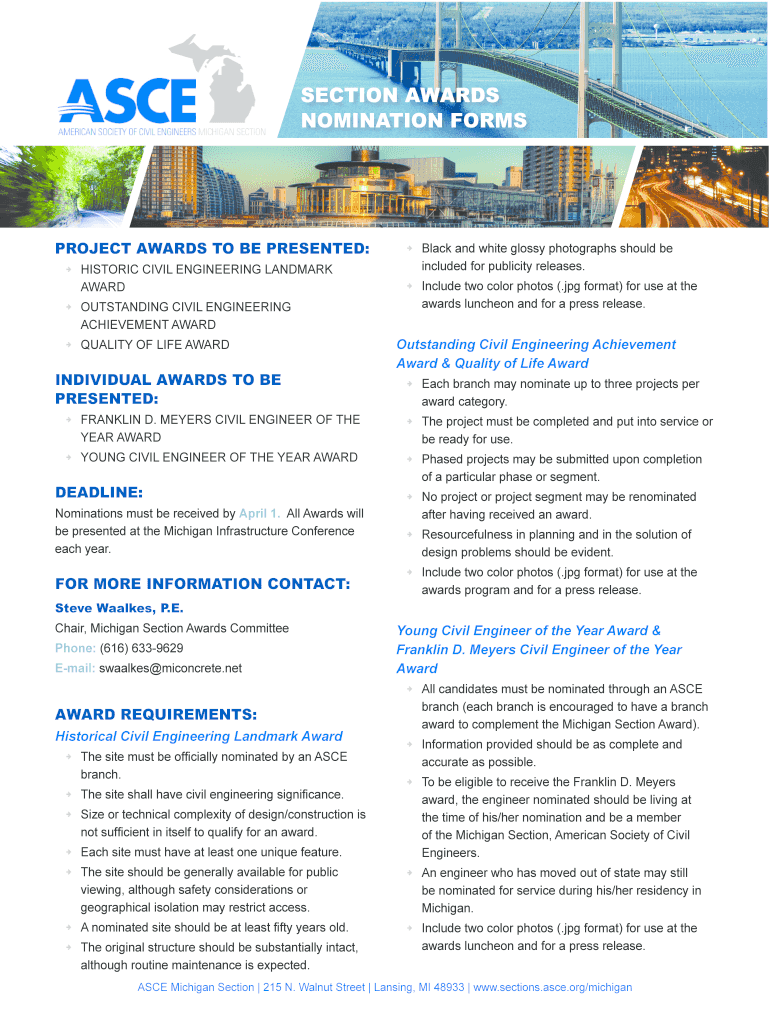 Section Awards Nomination Forms PROJECT AWARDS TO BE PRESENTED: HISTORIC CIVIL ENGINEERING LANDMARK AWARD OUTSTANDING CIVIL ENGINEERING ACHIEVEMENT AWARD QUALITY OF LIFE AWARD INDIVIDUAL AWARDS TO