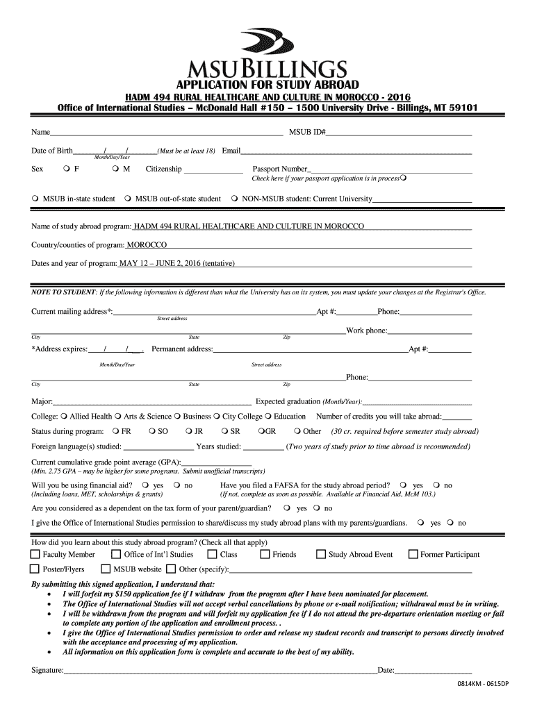 Get the free Phase 1: Application Materials - Due in the Office of ... - msubillings