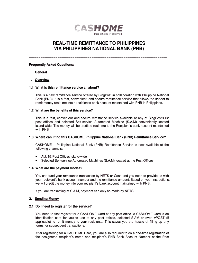 MEALTIME REMITTANCE TO PHILIPPINES VIA PHILIPPINES NATIONAL BANK (PNB) Frequently Asked Questions: General 1. Overview 1.1 What is this remittance service all about? This is a new remittance service