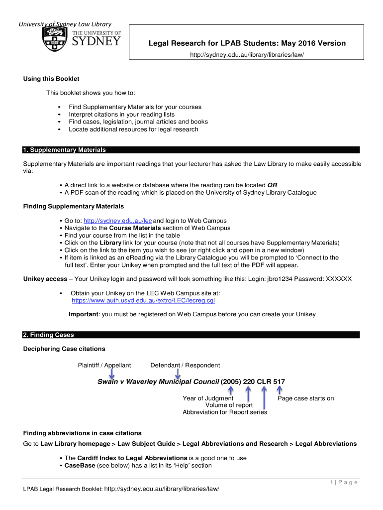 University of Sydney Law LibraryLegal Research for LAB Students: May 2016 Version http://sydney.edu.au/library/libraries/law/Using this Booklet shows you how to: Find Supplementary Materials for your