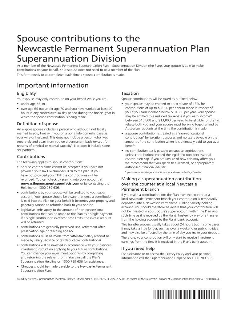 Spouse contributions to the Newcastle Permanent Superannuation Plan Superannuation Division As a member of the Newcastle Permanent Superannuation Plan Superannuation Division (the Plan), your spouse