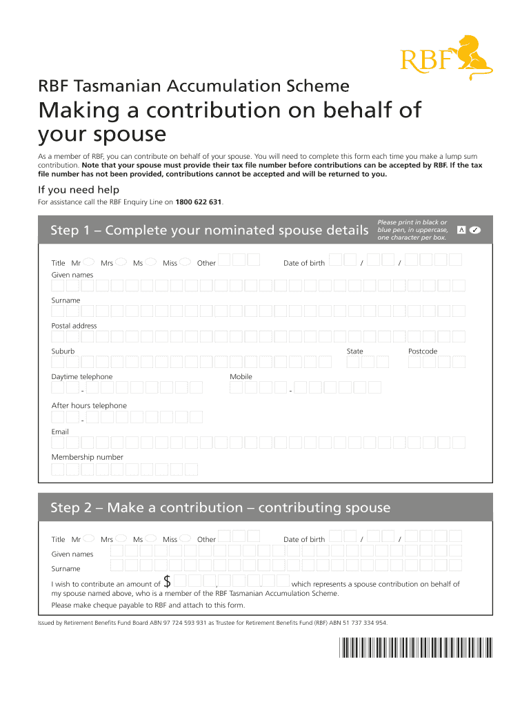RBF Tasmanian Accumulation Scheme Making a contribution on behalf of your spouse As a member of RBF, you can contribute on behalf of your spouse. You will need to complete this form each time you