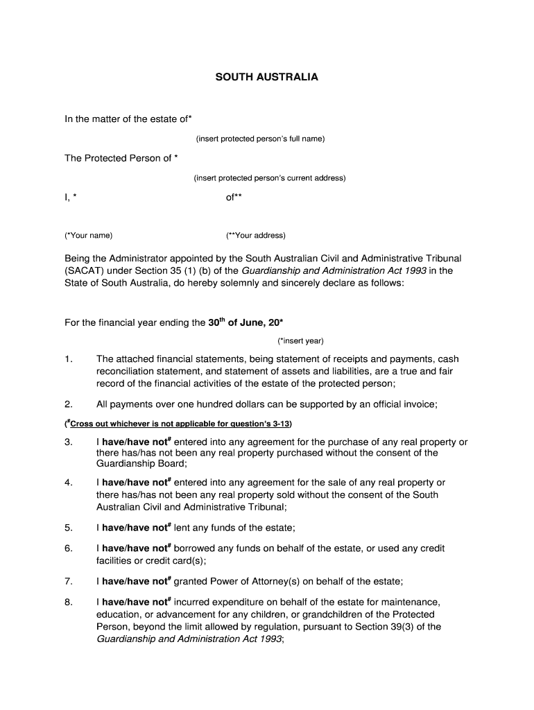 SOUTH AUSTRALIA In the matter of the estate of* (insert protected persons full name) The Protected Person of * (insert protected persons current address) I, * of** (*Your name) (**Your address) Being