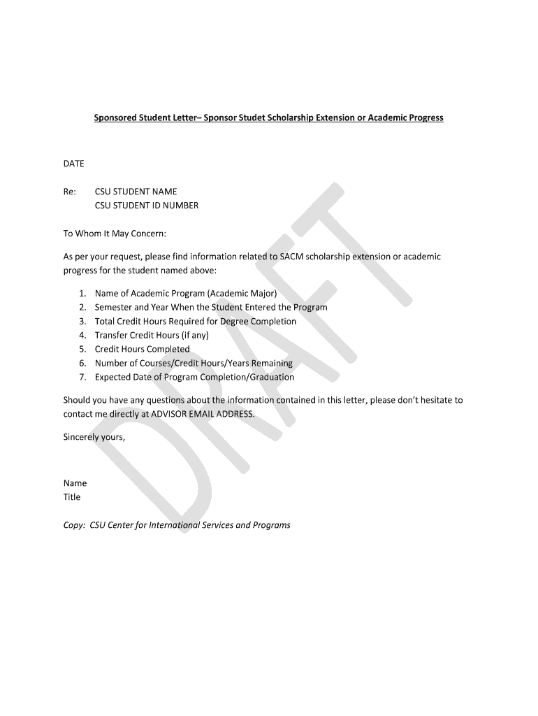 Sponsored Student Letter Sponsor Student Scholarship Extension or Academic Progressive