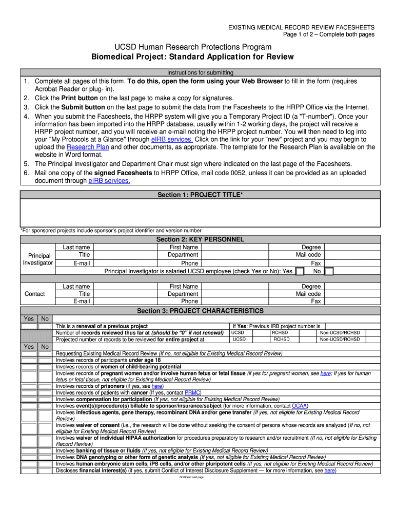 Get the free EXISTING MEDICAL RECORD REVIEW FACESHEETS - irb ucsd