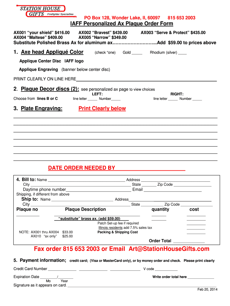 PRINT CLEARLY ON LINE HERE 2. Plaque Decor discs (2): see personalized ax ... Fax order 815 653 2003 or Email Art StationHouseGifts.com. 5.
