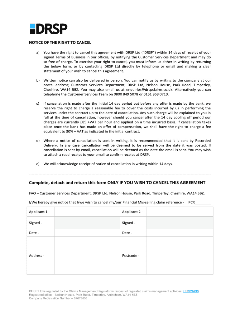 NOTICE OF THE RIGHT TO CANCEL a) You have the right to cancel this agreement with DROP Ltd (DROP) within 14 days of receipt of your signed Terms of Business in our offices, by notifying the Customer