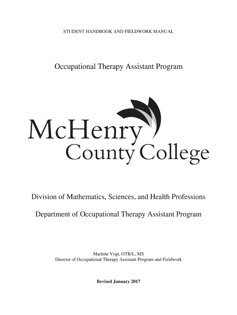 STUDENT HANDBOOK AND FIELDWORK MANUAL Occupational Therapy Assistant Program Division of Mathematics, Sciences, and Health Professions Department of Occupational Therapy Assistant Program Marlene