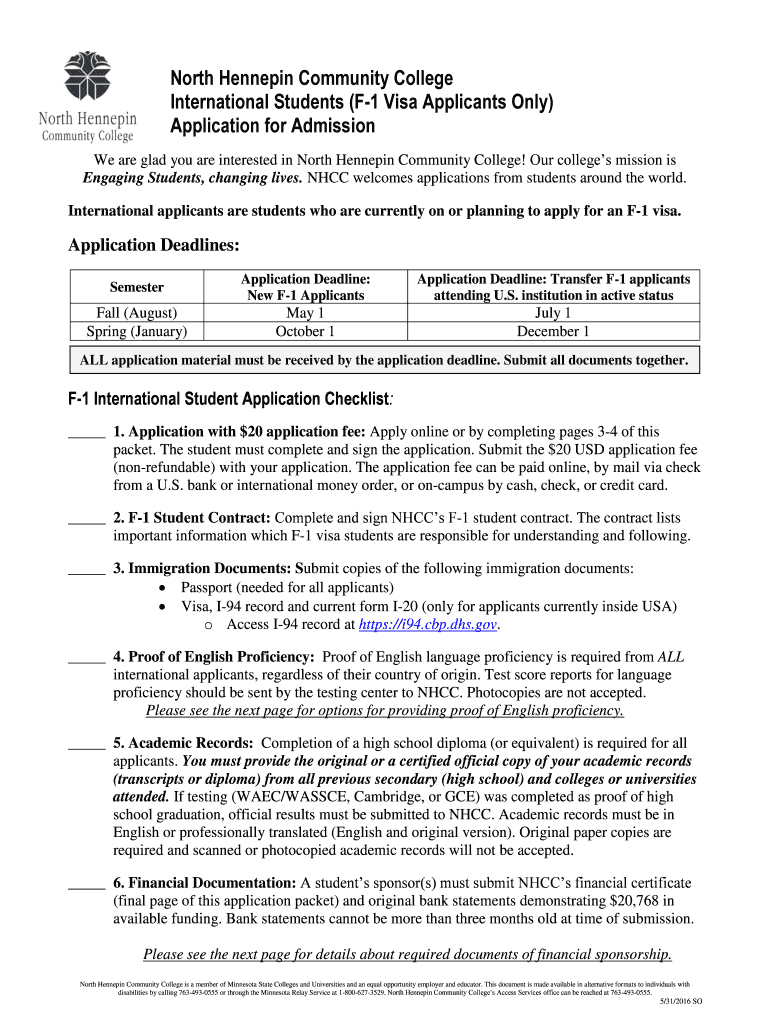 North Hennepin Community College International Students (F1 Visa Applicants Only) Application for Admission We are glad you are interested in North Hennepin Community College! Our colleges mission