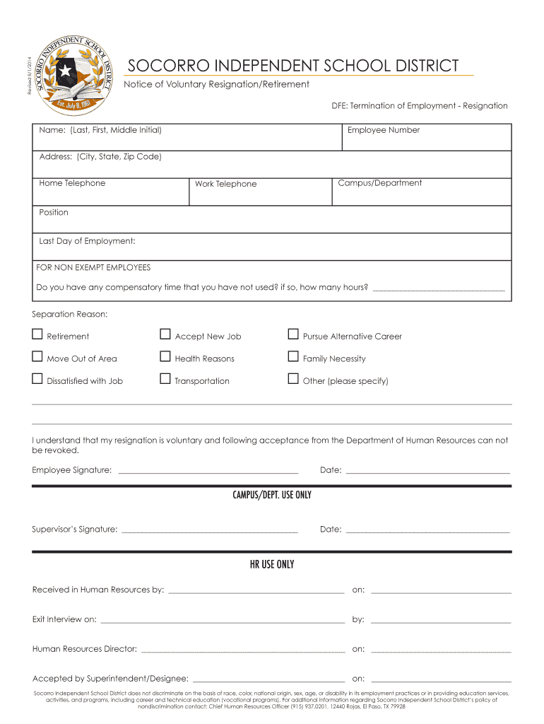 Revised 8/1/2014 SOCORRO INDEPENDENT SCHOOL DISTRICT Notice of Voluntary Resignation/Retirement DFE: Termination of Employment Resignation Name: (Last, First, Middle Initial) Employee Number Address: