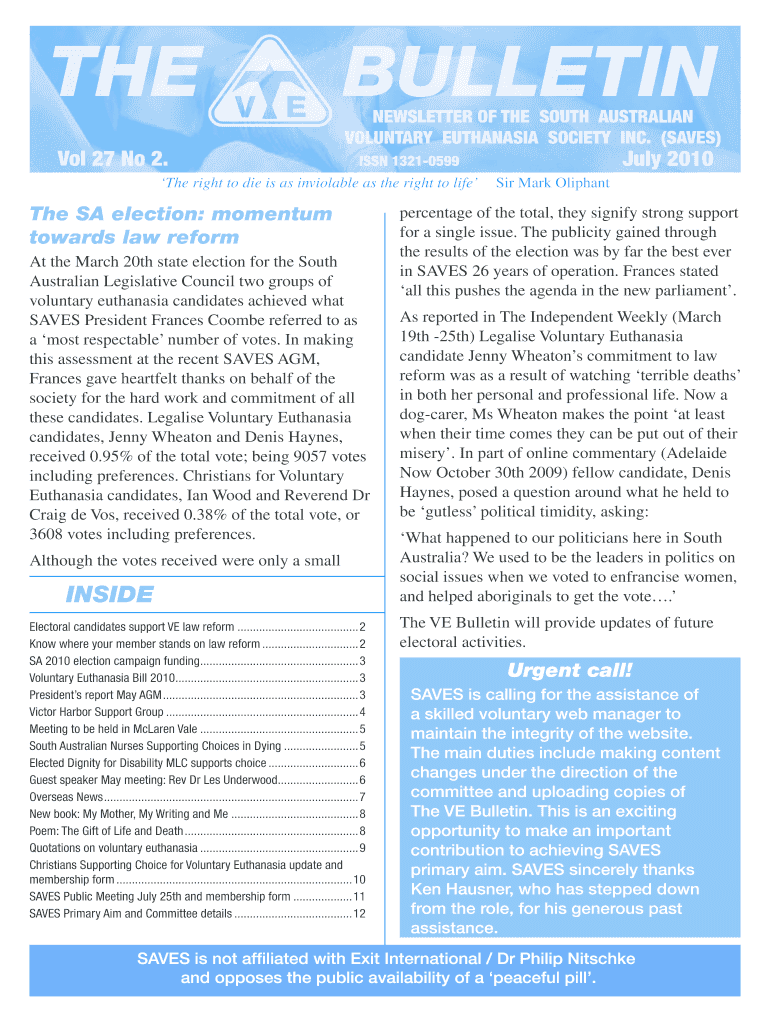 THE Vol 27 No 2. BULLETIN NEWSLETTER OF THE SOUTH AUSTRALIAN VOLUNTARY EUTHANASIA SOCIETY INC. (SAVES) ISSN 1321-0599 July 2010 The right to die is as inviolable as the right to life The SA election:
