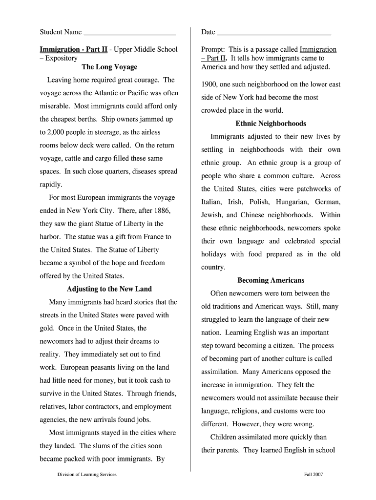 Student Name Date Immigration Part II Upper Middle School Expository The Long Voyage Prompt: This is a passage called Immigration Part II. It tells how immigrants came to America and how they settled