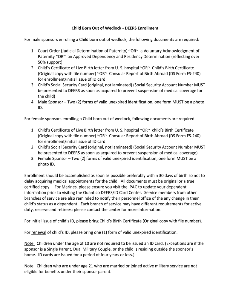Child Born Out-of-Wedlock DEER Enrollment For male sponsors enrolling a Child born out of wedlock, the following documents are required: 1. Court Order (Judicial Determination of Paternity) OR a Voluntary