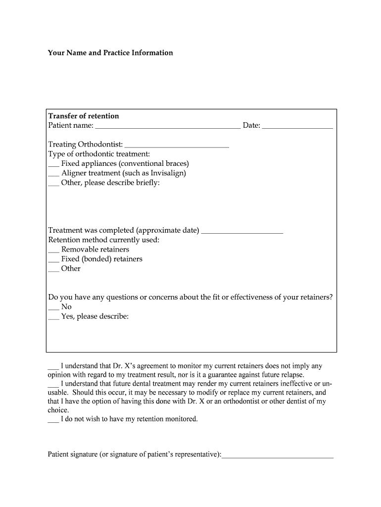 Your Name and Practice Information Transfer of retention Patient name: Date: Treating Orthodontist: Type of orthodontic treatment: Fixed appliances (conventional braces) Aligner treatment (such as