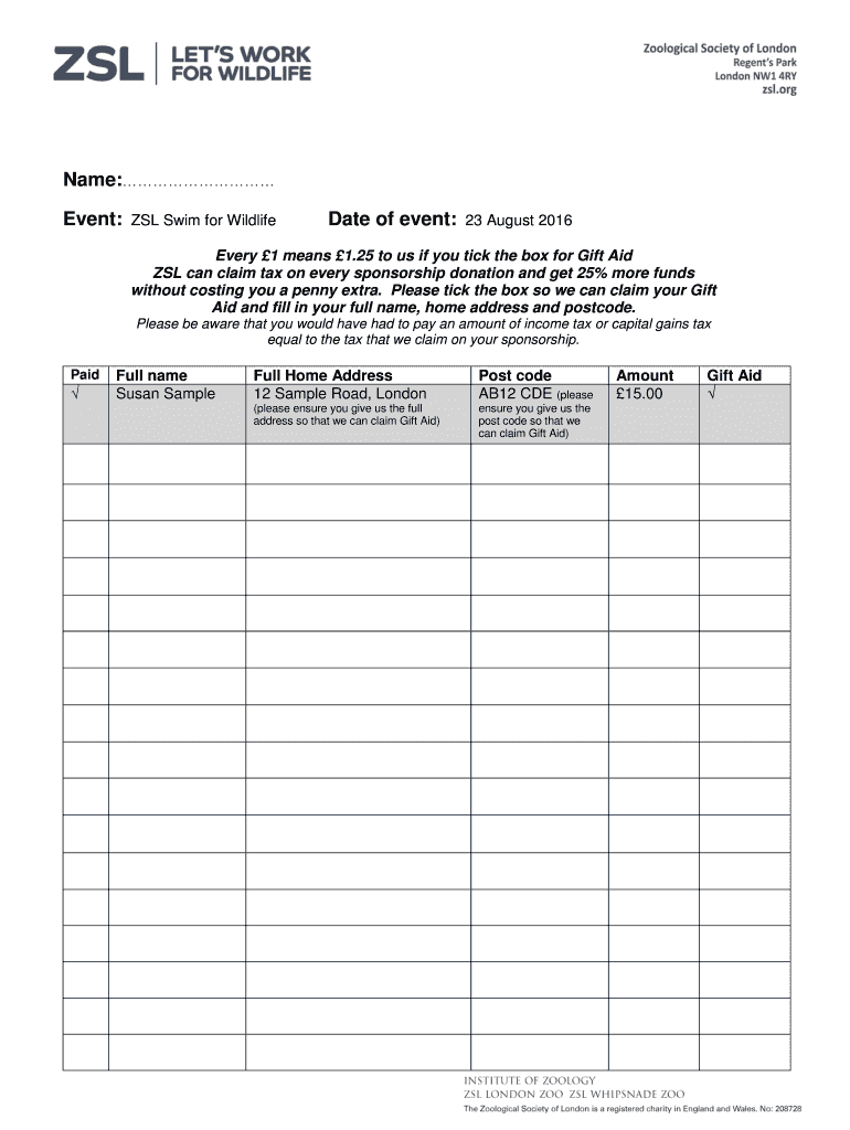 Name: Event: ZSL Swim for Wildlife Date of event: 23 August 2016 Every 1 means 1.25 to us if you tick the box for Gift Aid ZSL can claim tax on every sponsorship donation and get 25% more funds without