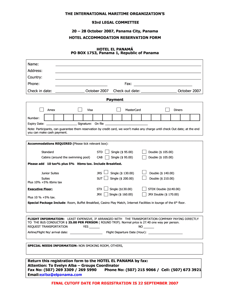 Print Form THE INTERNATIONAL MARITIME ORGANIZATIONS 93rd LEGAL COMMITTEE 20 28 October 2007, Panama City, Panama HOTEL ACCOMMODATION RESERVATION FORM HOTEL EL PANAMA PO BOX 1753, Panama 1, Republic