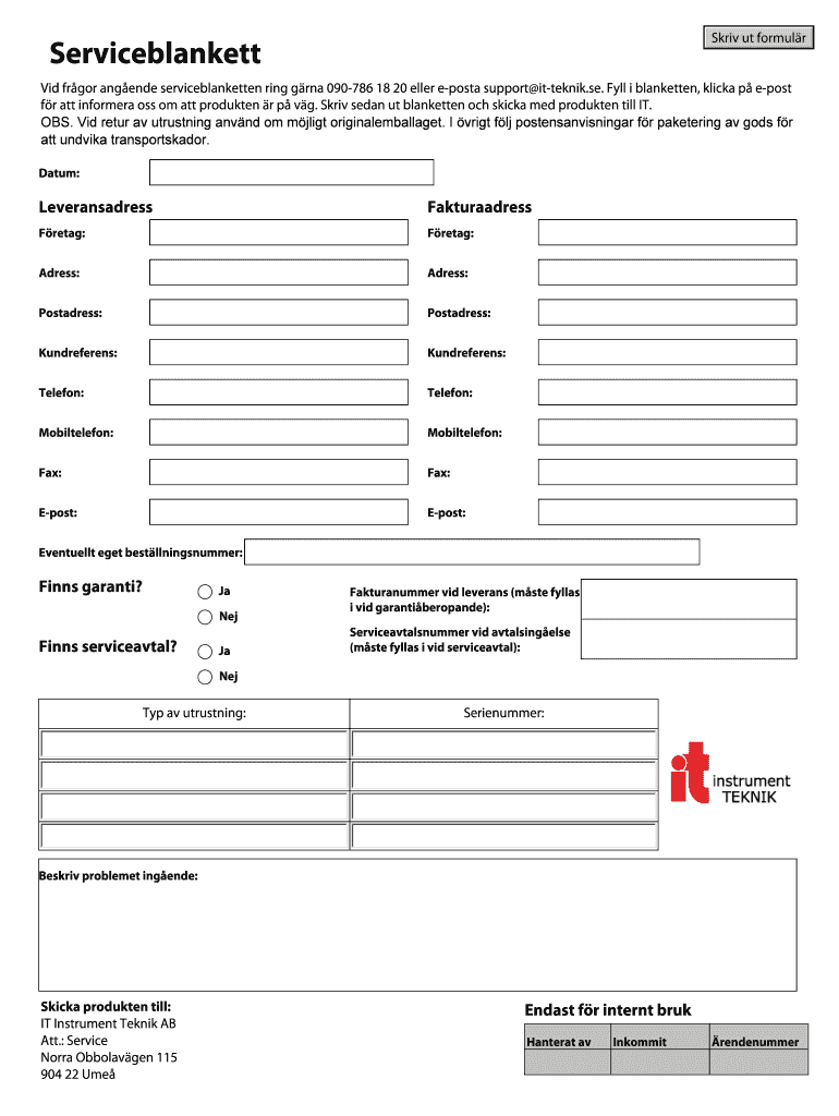 Serviceblankett. Vid for go rang end serviceblanketten ring g RNA 090-786 18 20 elder post support it-teknik.SE. Fall I blanket ten, kick p e-post.