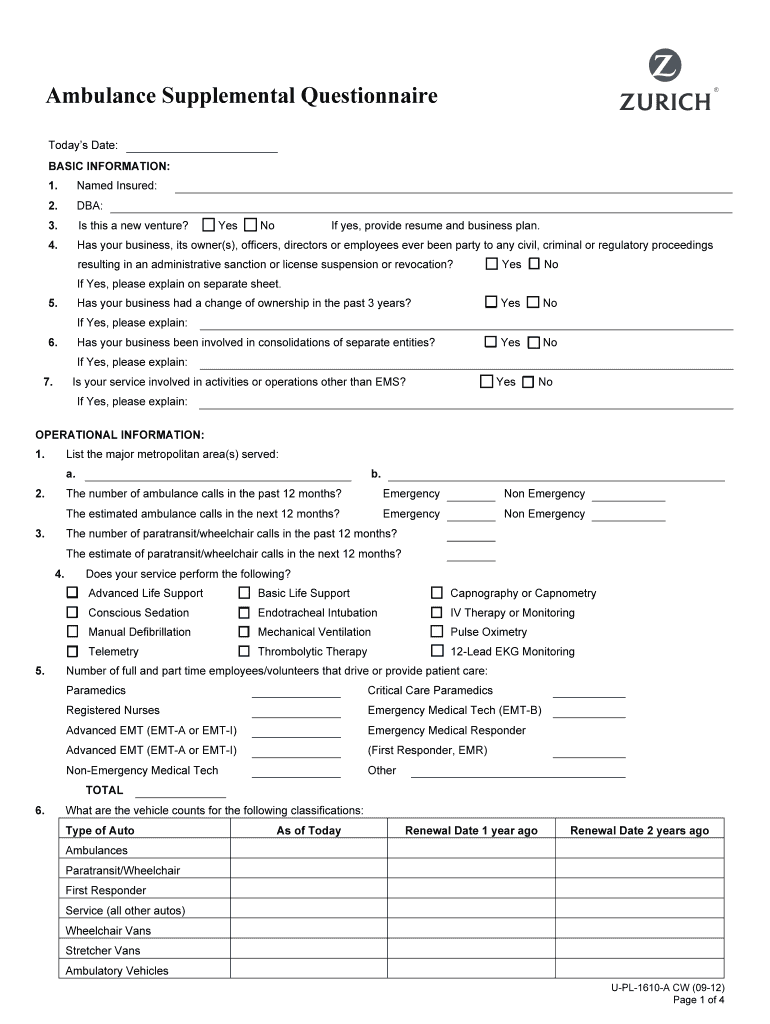 Get the free 1348243512Zurich Ambulance Supplemental Questionnaire Final U-PL-1610-A CW 091912.docx
