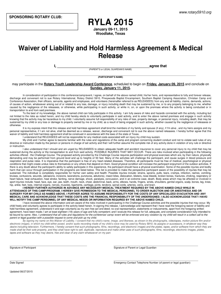 Get the free Waiver of Liability and Hold Harmless Agreement & Medical ... - clubrunner