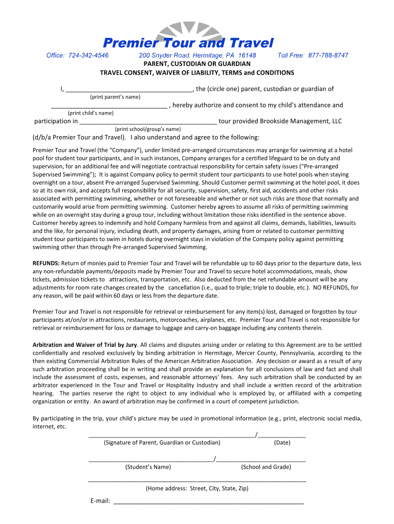 TRAVEL CONSENT, WAIVER OF LIABILITY, TERMS and CONDITIONS I, the (circle one) parent, custodian or guardian of (print parent s name) ...