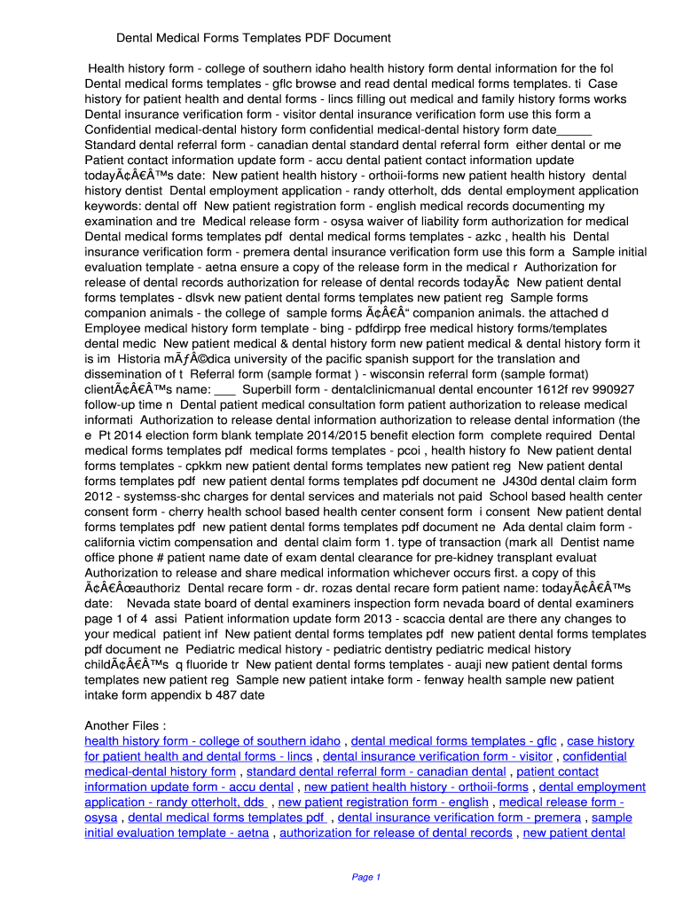 Dental Medical Forms Templates PDF Document Health history form college of southern Idaho health history form dental information for the fol Dental medical forms templates GFC browse and read dental