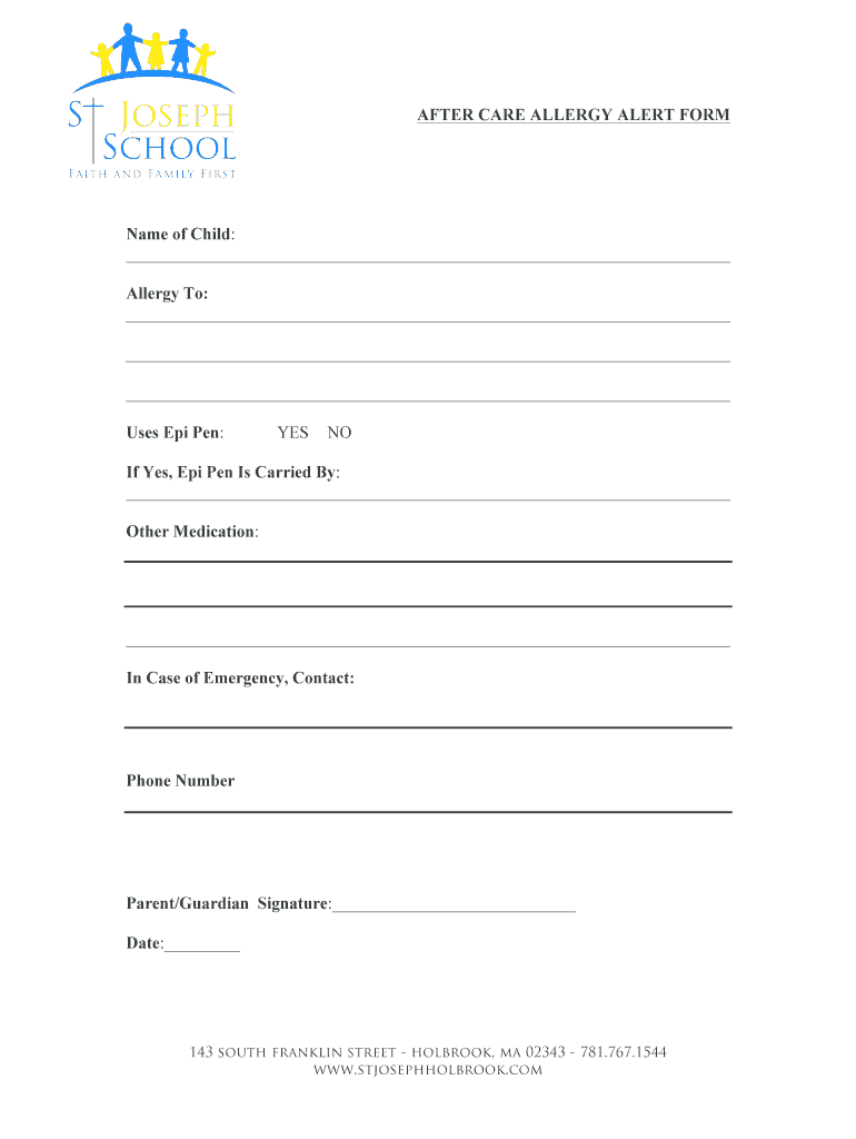 AFTER CARE ALLERGY ALERT FORM Name of Child: Allergy To: Uses EPI Pen: YES NO If Yes, EPI Pen Is Carried By: Other Medication: In Case of Emergency, Contact: Phone Number Parent/Guardian Signature: