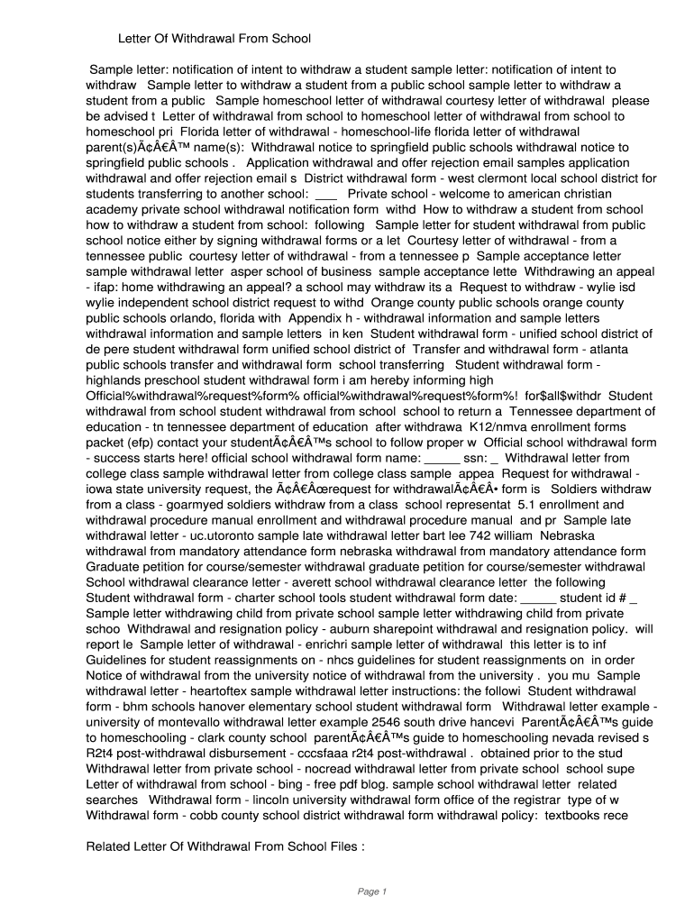 Letter Of Withdrawal From School Sample letter: notification of intent to withdraw a student sample letter: notification of intent to withdraw Sample letter to withdraw a student from a public school