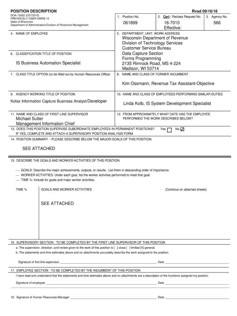 POSITION DESCRIPTION RVs 09/16/16 DOA15302 (C07/2015) PREVIOUSLY OSERDMRS10 State of Wisconsin Department of Administration/Division of Personnel Management 1. Position No. 4. NAME OF EMPLOYEE 5.