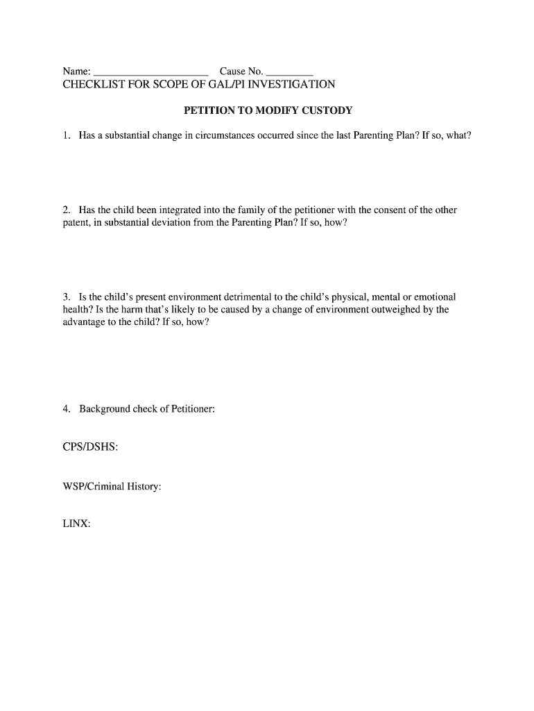 Name: Cause No. CHECKLIST FOR SCOPE OF GAL/PI INVESTIGATION PETITION TO MODIFY CUSTODY 1. Has a substantial change in circumstances occurred since the last Parenting Plan? If so, what? 2. Has the