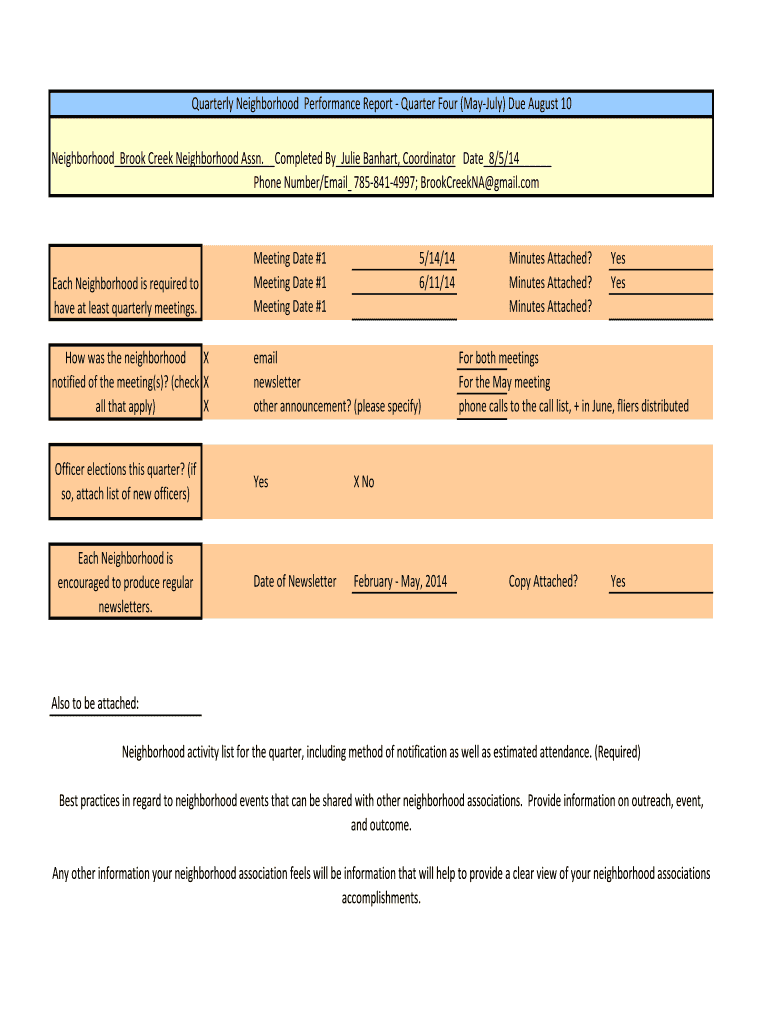 Quarterly Neighborhood Performance Report Quarter Four (May July) Due August 10 Neighborhood Brook Creek Neighborhood Assn. Completed By Julie Ban hart, Coordinator Date 8/5/14 Phone Number/Email