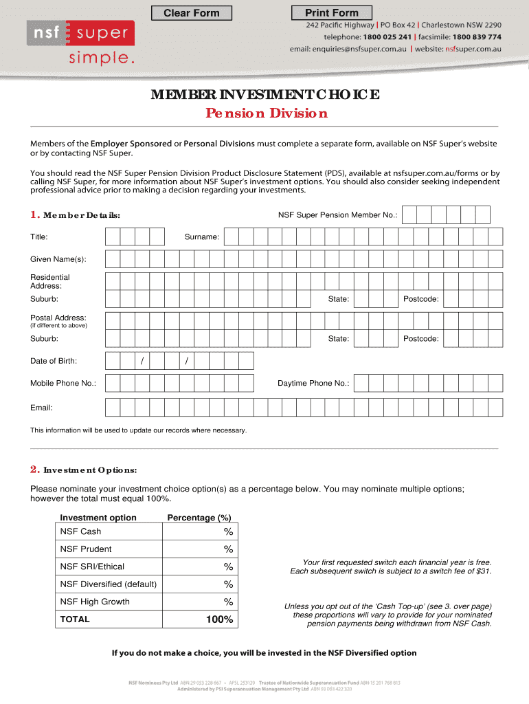 MEMBER INVESTMENT CHOICE Pension Division Members of the Employer Sponsored or Personal Divisions must complete a separate form, available on NSF Super s website