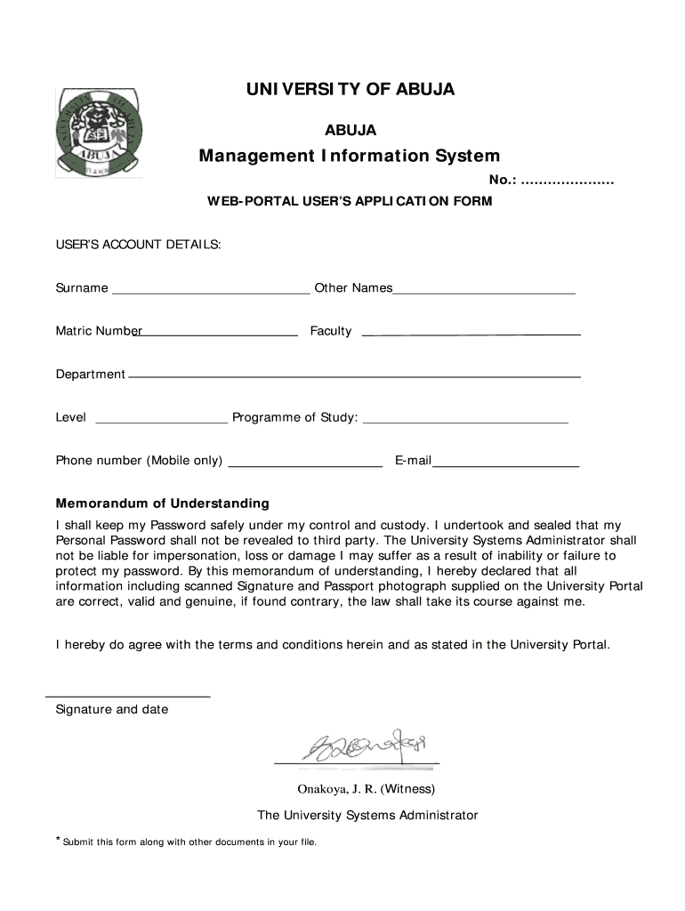 UNIVERSITY OF ABUJA Management Information System No.: PORTAL USERS APPLICATION FORM USERS ACCOUNT DETAILS: Surname Other Names Matrix Number Faculty Department Level Program of Study: Phone number