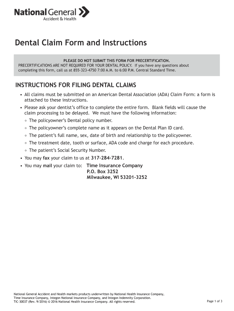 Dental Claim Form and Instructions PLEASE DO NOT SUBMIT THIS FORM FOR RECERTIFICATION. RECERTIFICATIONS ARE NOT REQUIRED FOR YOUR DENTAL POLICY. If you have any questions about completing this form,
