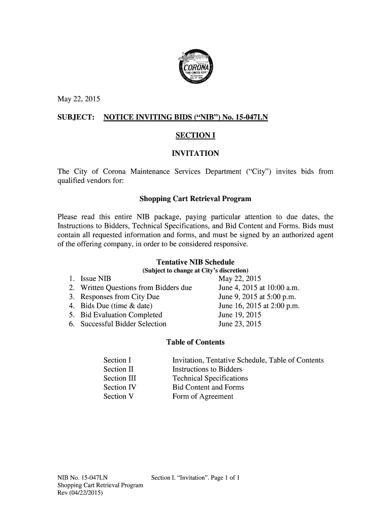 May 22, 2015, SUBJECT: NOTICE INVITING BIDS (NIB) No. 15047LN SECTION I INVITATION The City of Corona Maintenance Services Department (City) invites bids from qualified vendors for: Shopping Cart