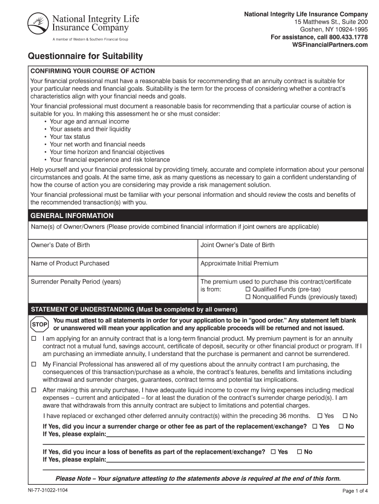 National Integrity Life Insurance Company 15 Matthews St., Suite 200 Goshen, NY 10924-1995 For assistance, call 800.433.1778 WSFinancialPartners.com Questionnaire for Suitability CONFIRMING YOUR COURSE