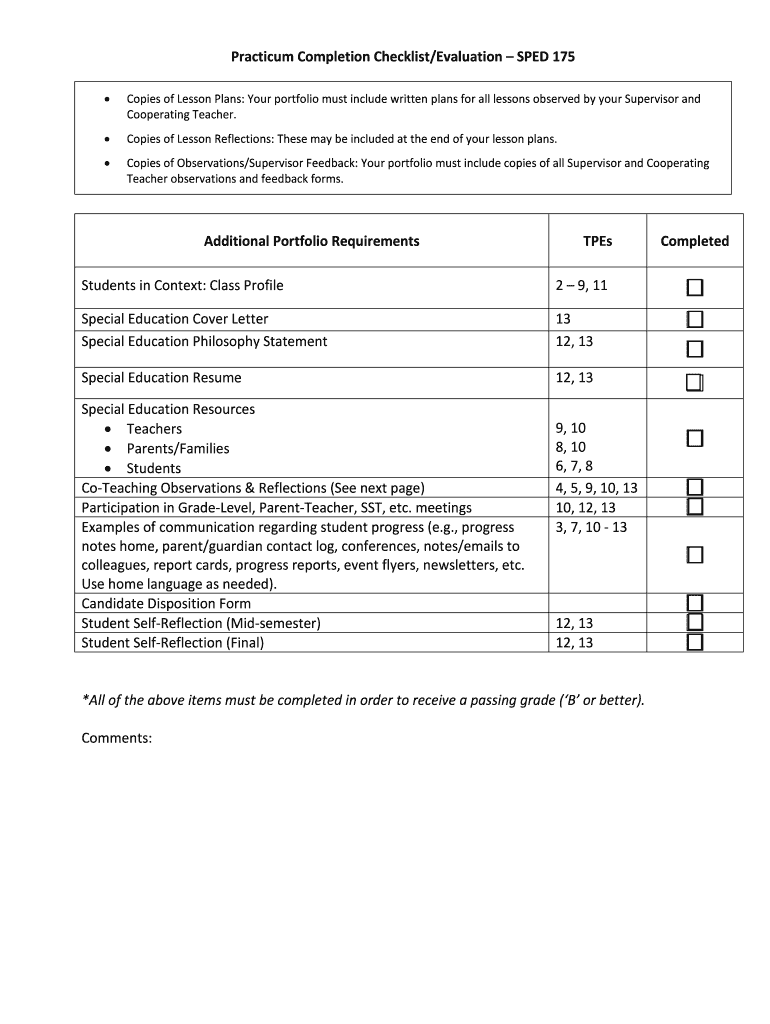 Get the free Practicum Completion Checklist/Evaluation SPED 175 Additional ... - fresnostate