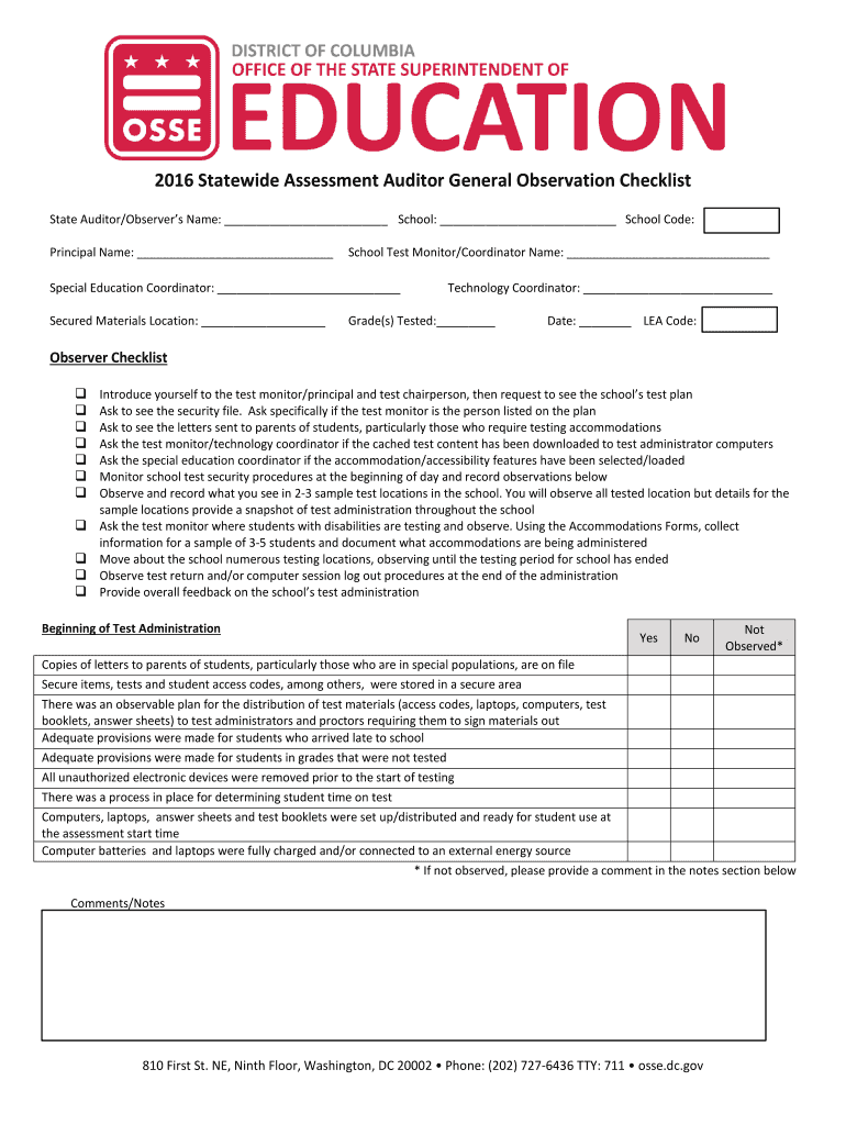Get the free 2016 Statewide Assessment Auditor General Observation Checklist - osse dc