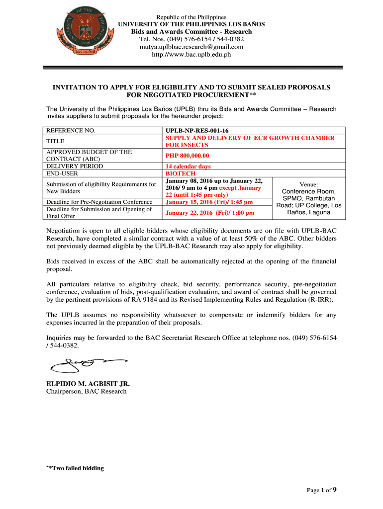 Republic of the Philippines UNIVERSITY OF THE PHILIPPINES LOS BASS Bids and Awards Committee Research Tel. Nos. (049) 5766154 / 5440382 duty.upbeat.research gmail.com http://www.bac.uplb.edu.ph INVITATION